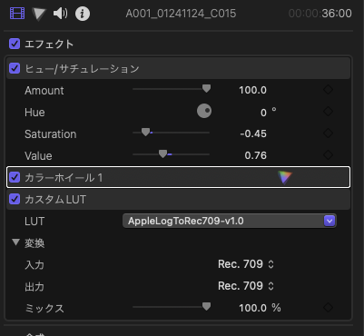 カスタムLUTカラー調整やヒュー/サチュレーションなどを同様にクリップに追加して、カスタムLUTよりも上に持っていく。カスタムLUTよりも上に持ってくるのが大事で、処理の流れ的に先に適用させる必要がある。